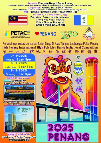 “第十四届槟城国际高桩舞狮邀请赛”将于11月7日(周五)至9日(周日),在威中上海滩饮食中心(Shanghai Paradise Food Court)精彩登场,41支国内外顶尖狮队将腾跃高桩、奋勇争辉,角逐狮王宝座,比赛开放公众免费入场观赏!