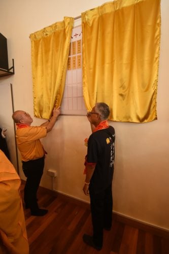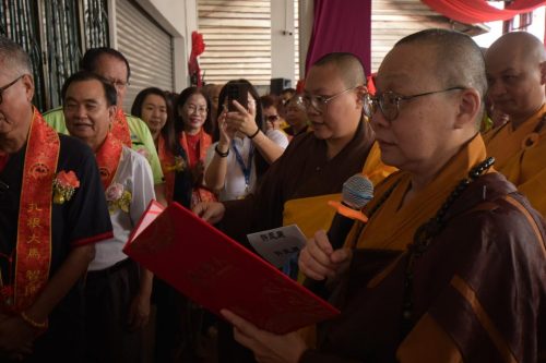 当天,法炬山僧团带领大众一起诵经、祈福。主法和尚在佛号中带领建委会一起启门、揭帘,象征开启般若之门,迎接佛光普照,法炬耀人间,新愿的开启与未来的希望。