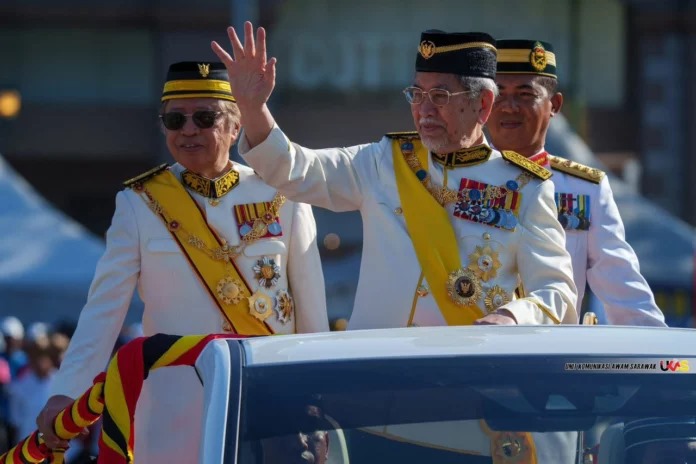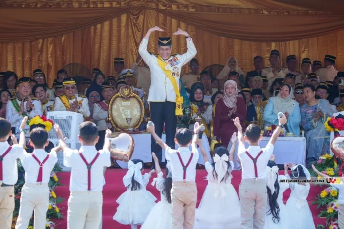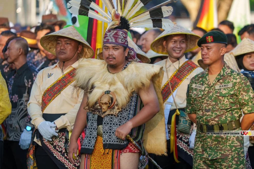 砂元首敦旺朱乃迪随后在砂总理拿督巴丁宜阿邦佐哈里陪同下,检阅由各单位组成的仪仗队,沿途受到热烈欢呼与掌声欢迎,现场聚集的民众也挥舞旗帜,为这一庄严时刻增添浓厚的庆典气氛。