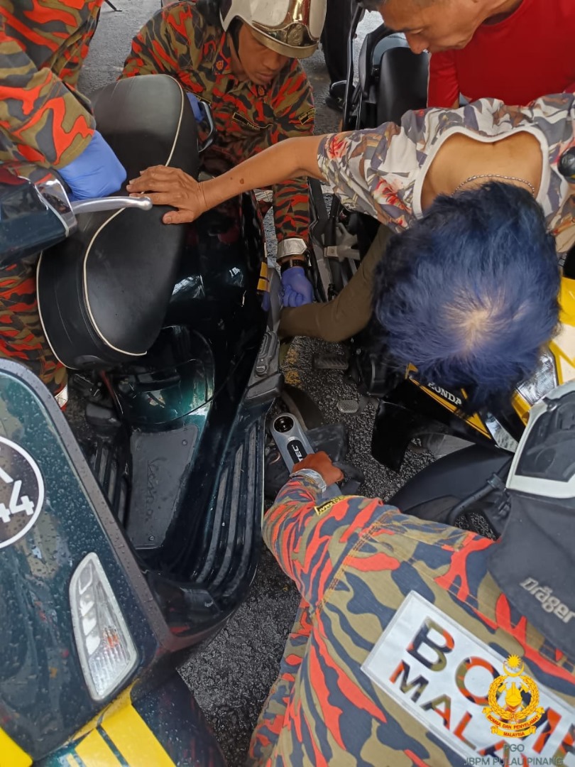61岁华妇疑脚踏启动摩托车时,右脚不慎插入身旁摩托车的中撑(center stand)缝隙里而向消拯局求救,消拯员使用工具协助妇女脱困。