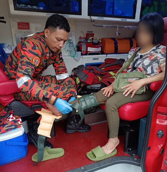 消拯员到场后,使用工具协助妇女脱困,并帮她右脚绑上护具,再由救护车送往槟城中央医院治疗。