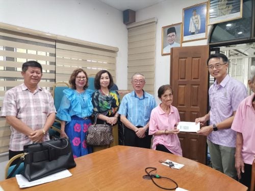 威中县署到峇冬丁宜安老院颁发“槟州爱缘基金“给院内已登记的16位老人,李凯伦(右1)移交基金给老人。左1起王福盛、许涵妮、李来镅及拿督陈良成。