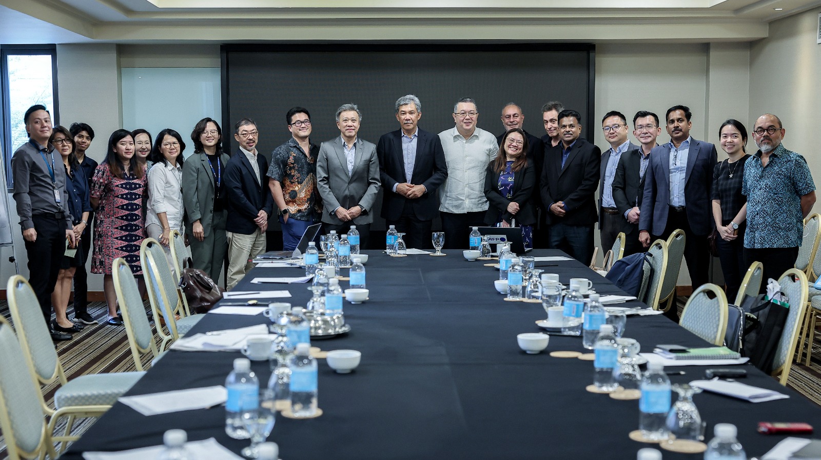 莫哈末哈山周二在一家酒店出席与本地及国际媒体高层编辑的会晤后,与与会者合影留念。