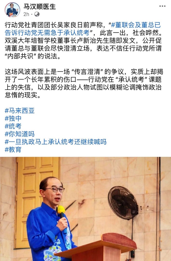 他周二针对马汉顺在脸书贴文指责行动党在“承认统考”课题失信的言论,发文告作出反驳表示,在其专访中,他清清楚楚地说,承认统考是希盟的竞选承诺与政纲,但这句话居然能被曲解成别的意思,马汉顺真是为我们上演了一出文字理解的奇迹。