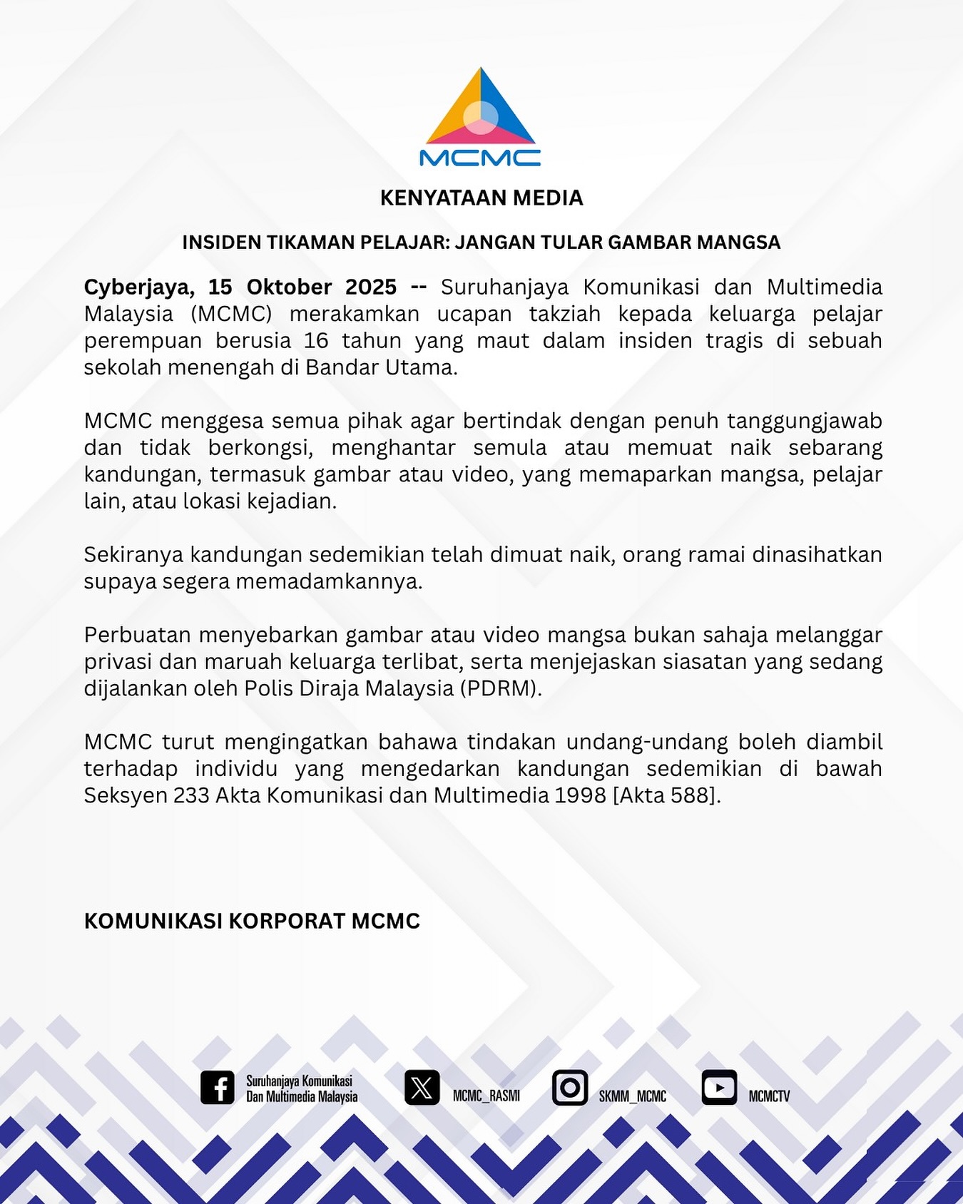 此外,在文告中,大马通讯及多媒体委员会也命案死者家属致哀。