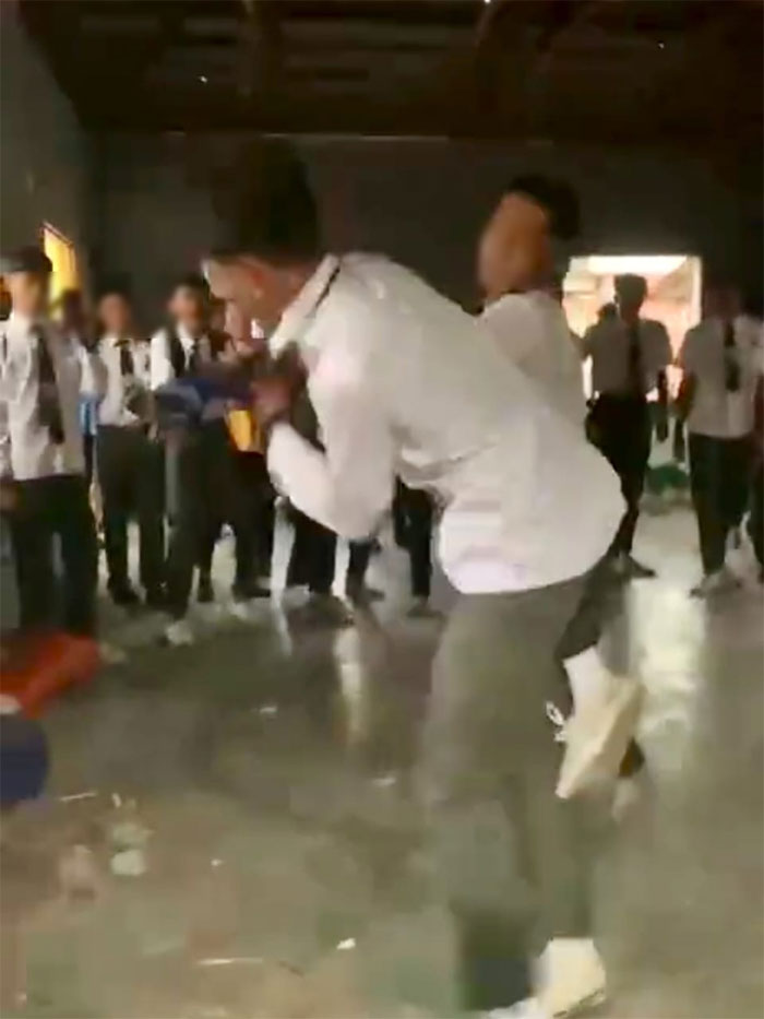 根据视频画面显示,两名学生在同学围观下,疑似事先约定进行“一对一”对打,旁人更以倒数助势,双方随即互相挥拳、踢踹,甚至有学生用手机拍摄全过程。
