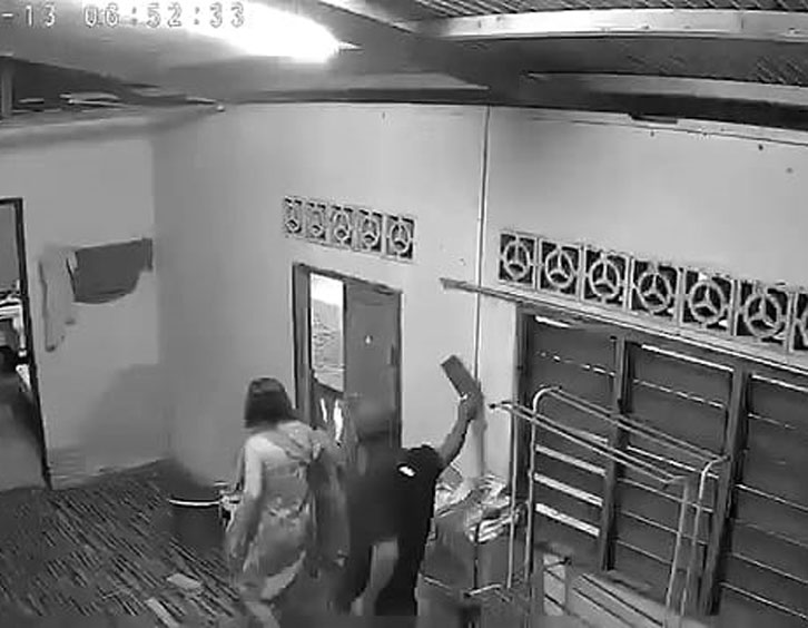 匪徒也一路挥刀一路尾随一名妇女进入一间房间,逼迫后者交出值钱财物,随后从容离去。