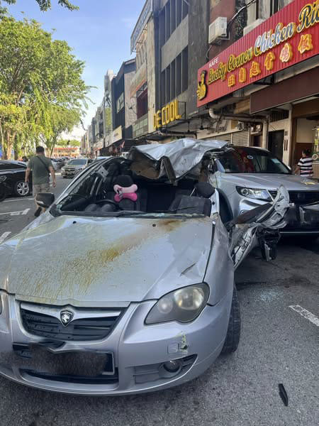 柔佛新山彩虹花园今早(16日)上演惊险一幕,一辆蓝色迷你库柏(Mini Cooper)轿车疑失控,“飞上”一辆红色轿车车顶,并卡在店铺招牌与轿车之间,引起大批好奇民众围观。