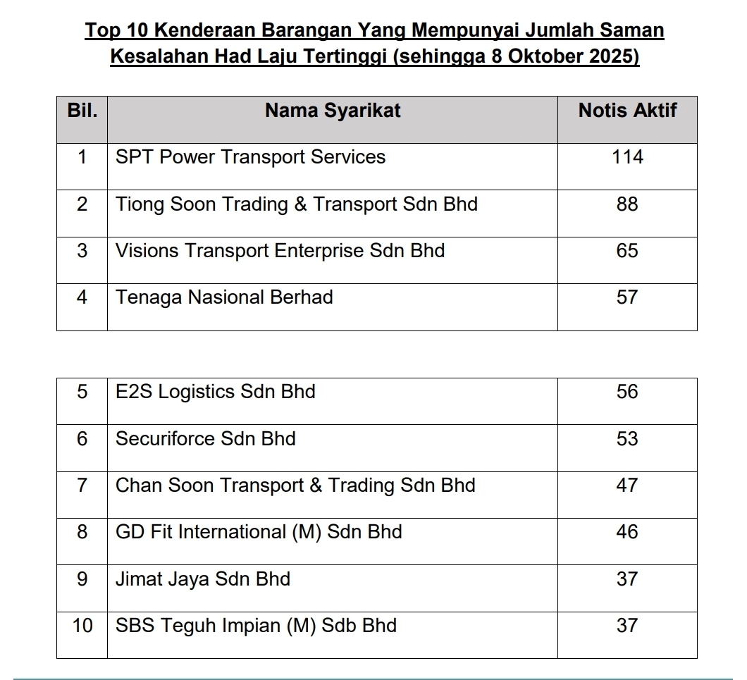 在货运公司方面,SPT Power Transport Services接获的超速罚单为114张、Tiong Soon Trading & Transport 私人有限公司(88张)、Visions Transport Enterprise 私人有限公司(65张)、Tenaga Nasional Berhad(57张)、E2S Logistics 私人有限公司(56张)、Securiforce 私人有限公司(53张)、Chan Soon Transport & Trading 私人有限公司(47张)、GD Fit International (M) 私人有限公司 (46张)、Jimat Jaya 私人有限公司(37张)、SBS Teguh Impian (M) Sdb Bhd(37张)。