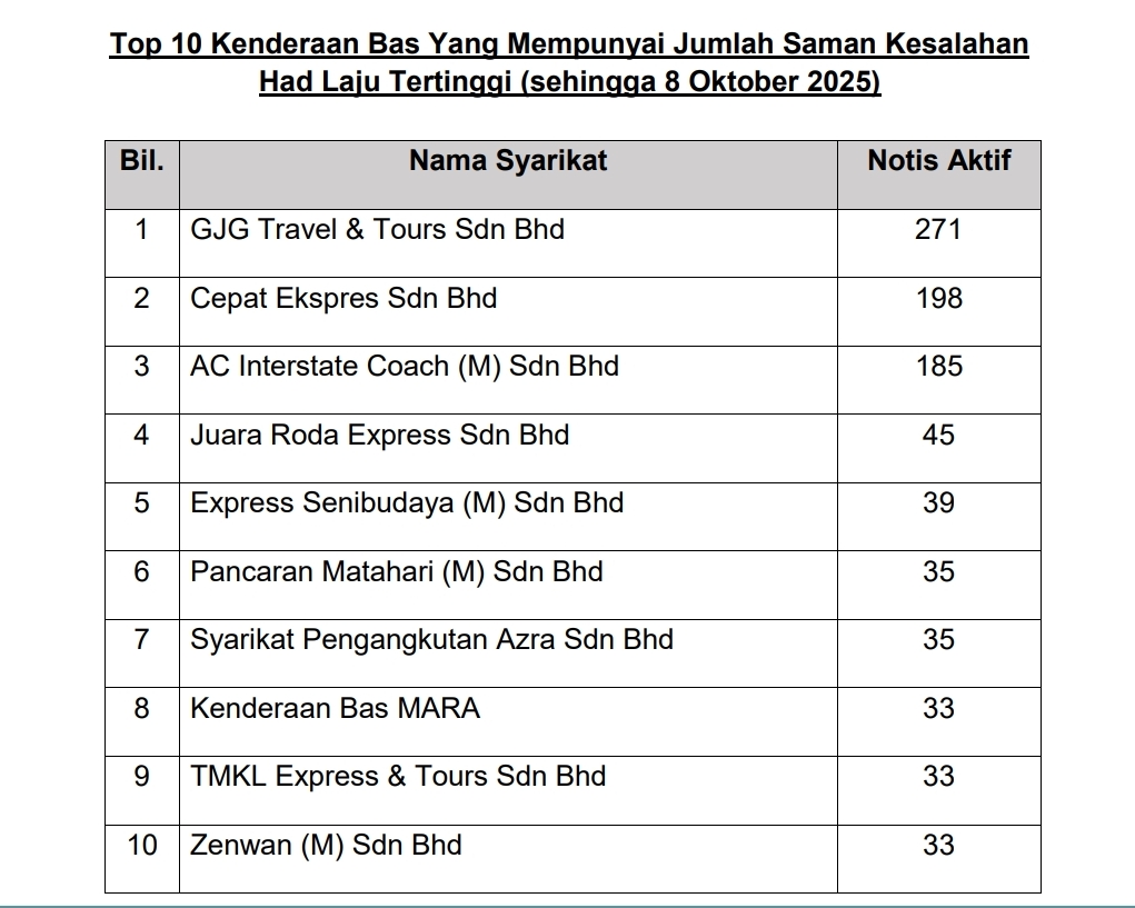 根据交通部长陆兆福透过国会书面回答亚沙国会议员谢琪清的询问时说,GJG Travel & Tours 私人有限公司接获271张超速罚单,接着是Cepat Ekspres 私人有限公司 (198张)、AC Interstate Coach (M) 私人有限公司(185张)、Juara Roda Express 私人有限公司(45张)、Express Senibudaya (M) 私人有限公司(39张)、Pancaran Matahari (M) 私人有限公司(35张)、Syarikat Pengangkutan Azra 私人有限公司(35张)、Kenderaan Bas MARA(33张)、TMKL Express & Tours 私人有限公司(33张)、Zenwan (M) 私人有限公司(33张)。