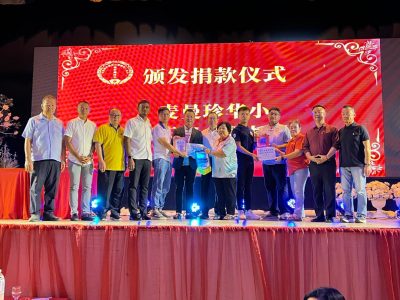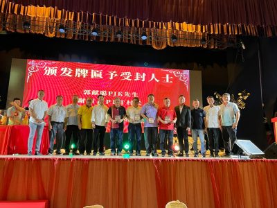 理事会亦趁着庆典联欢宴会,赠送纪念牌匾祝贺荣膺勋衔的郭献聪PJK,,陈意明PKT,谢振良PKT以及张哲华医生DJN。同时,理事会也赠送纪念牌匾予去年度热心参与投标福品的善士及商家。
