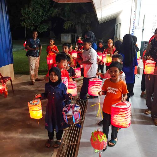 为鼓励创意与环保,校方特别举办了环保灯笼制作比赛。参赛作品精致多样,充分展示了学生们的巧思与心意。麻坑新村村委会也特为孩子们准备了五颜六色的传统灯笼。在提灯过程中,校长陈峻承亲自带领学生朗诵闽南语提灯童谣,让孩子们从中了解传统文化。