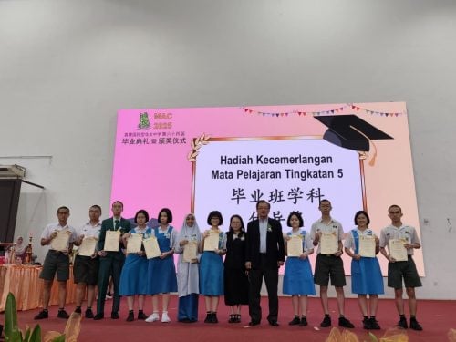 董事会总务拿督骆南辉(右5)颁发毕业班学科优异奖。