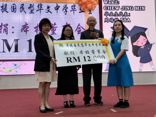 仪式上,毕业生代表周靖敏将毕业献金12000令吉移交董事会财政拿汀吴素玥,由陈达怀及林玉凤见证。