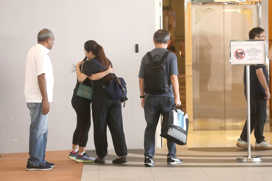 黄丽萍(左3)在灵堂与前来致哀的亲友拥抱,同时感激连日来民众们的关怀慰问。