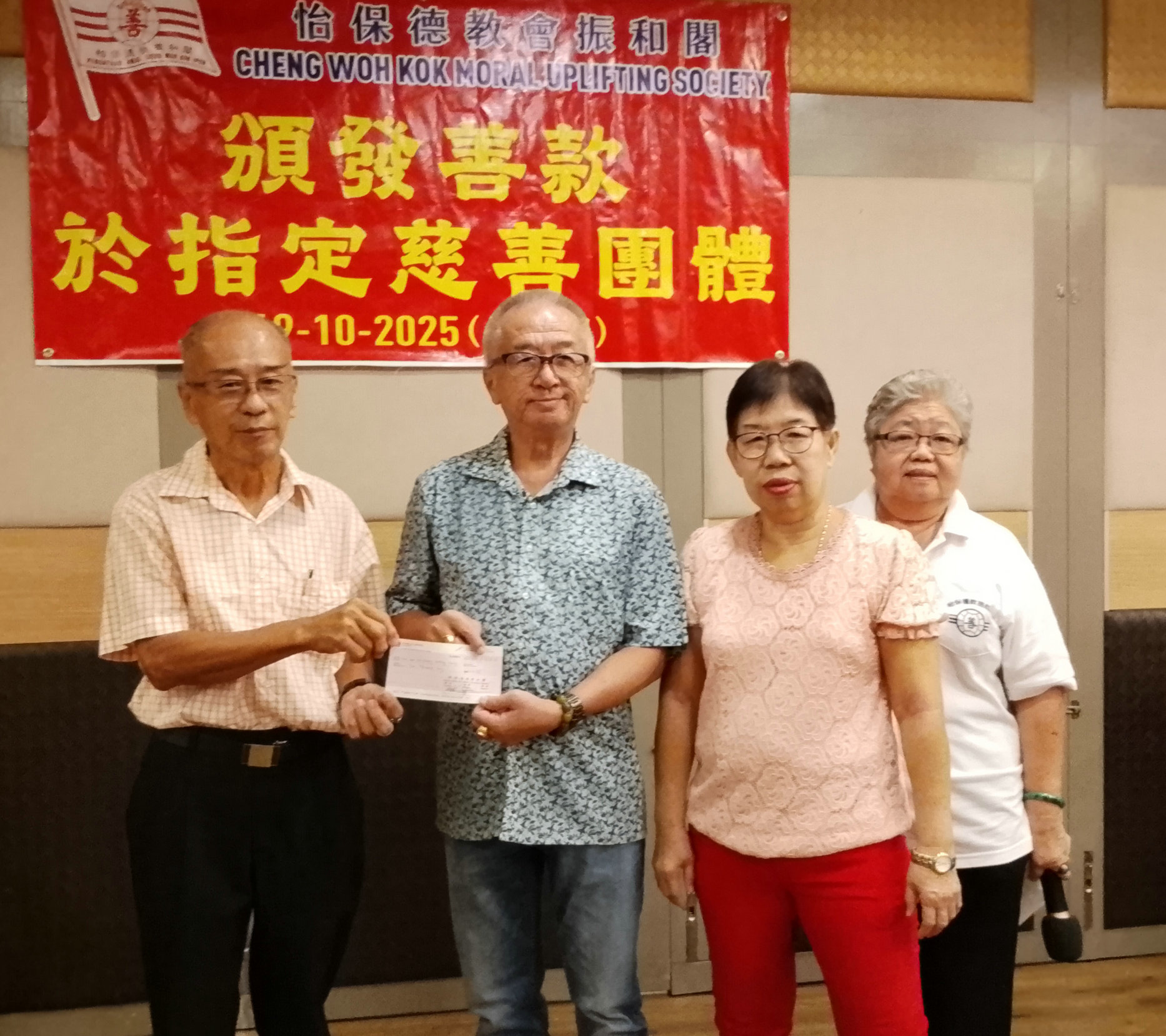 怡保均和园德教会振和阁基于即将解散,周一中午特将该阁剩余的18万1000令吉善款,由阁长胡礼川移交给21个远近慈善机构和学校社团。
