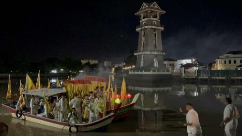 在吉打默贡斗母宫方面,该宫理事则前往吉打港口,乘船出海恭迎九皇大帝圣驾,同样吸引众多善信踊跃参与,场面热闹非凡。
