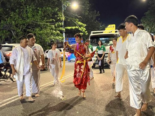 紧接着,接皇游行队伍于晚上8时30分,浩浩荡荡从河畔步行返回斗母宫,全程约5公里。参与迎皇的队伍包括21支来自各庙宇及社团的游行队伍,以及多位神明“降乩”乩童,沿路吸引大批善信驻足观礼、膜拜祈福。