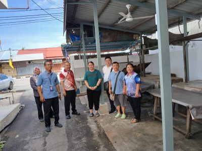 赖国平(左3)在县署官员的陪同下巡视甲抛峇底市区的猪肉销售处。