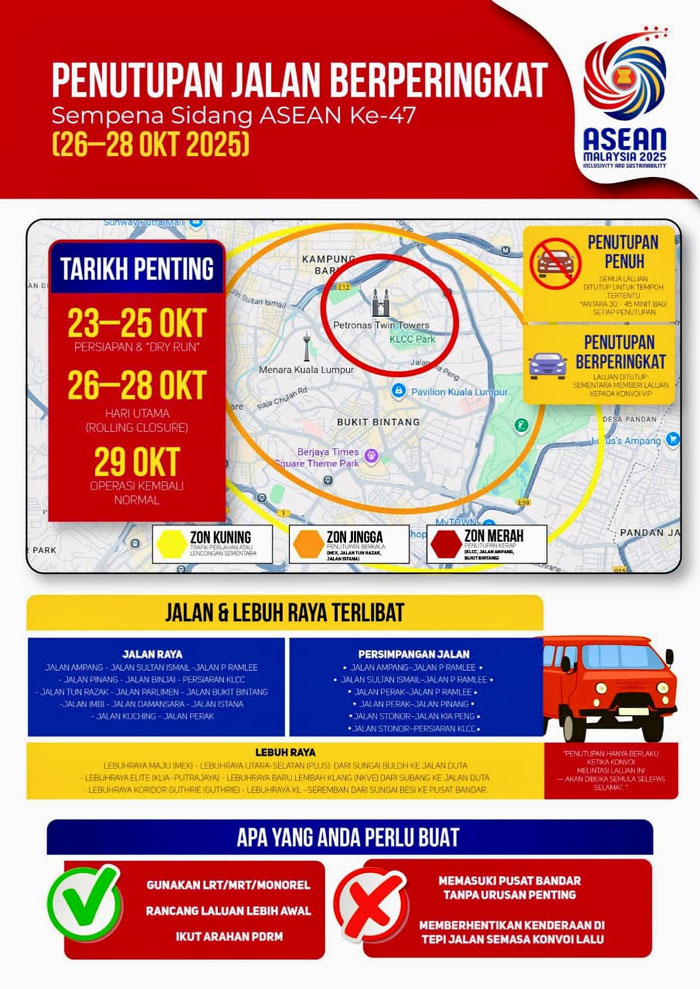 他指出,由于部分路段在峰会期间将实施交通管制或临时封路,因此,民众受促合理安排出行时间,特别是在会议中心周边、吉隆坡市中心、布城及主要道路上。
