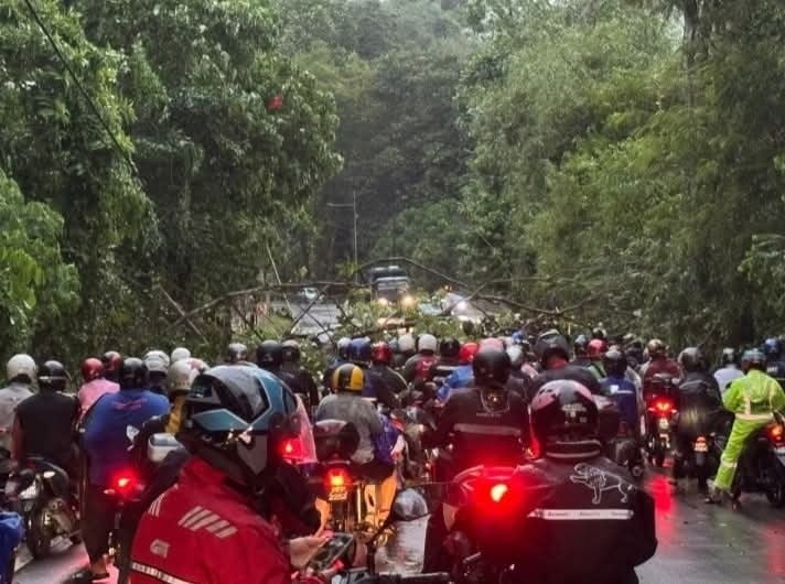 位于浮罗山背敦沙顿路其中大树倒下也横跨马路,导致车辆无法通行,引起大塞车。