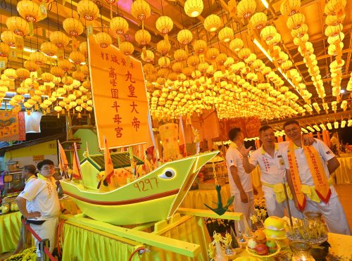 槟城发林高峰园斗母宫接任第8届槟州九皇大帝文化联谊御驾巡境大游行,当晚共有19家槟城庙宇,及沿路上来以五彩缤纷灯饰装饰而成的各类花车及乩童口穿银针徒步跟随队伍,参与全长11公里路程的巡境大游行,场面非常热闹。