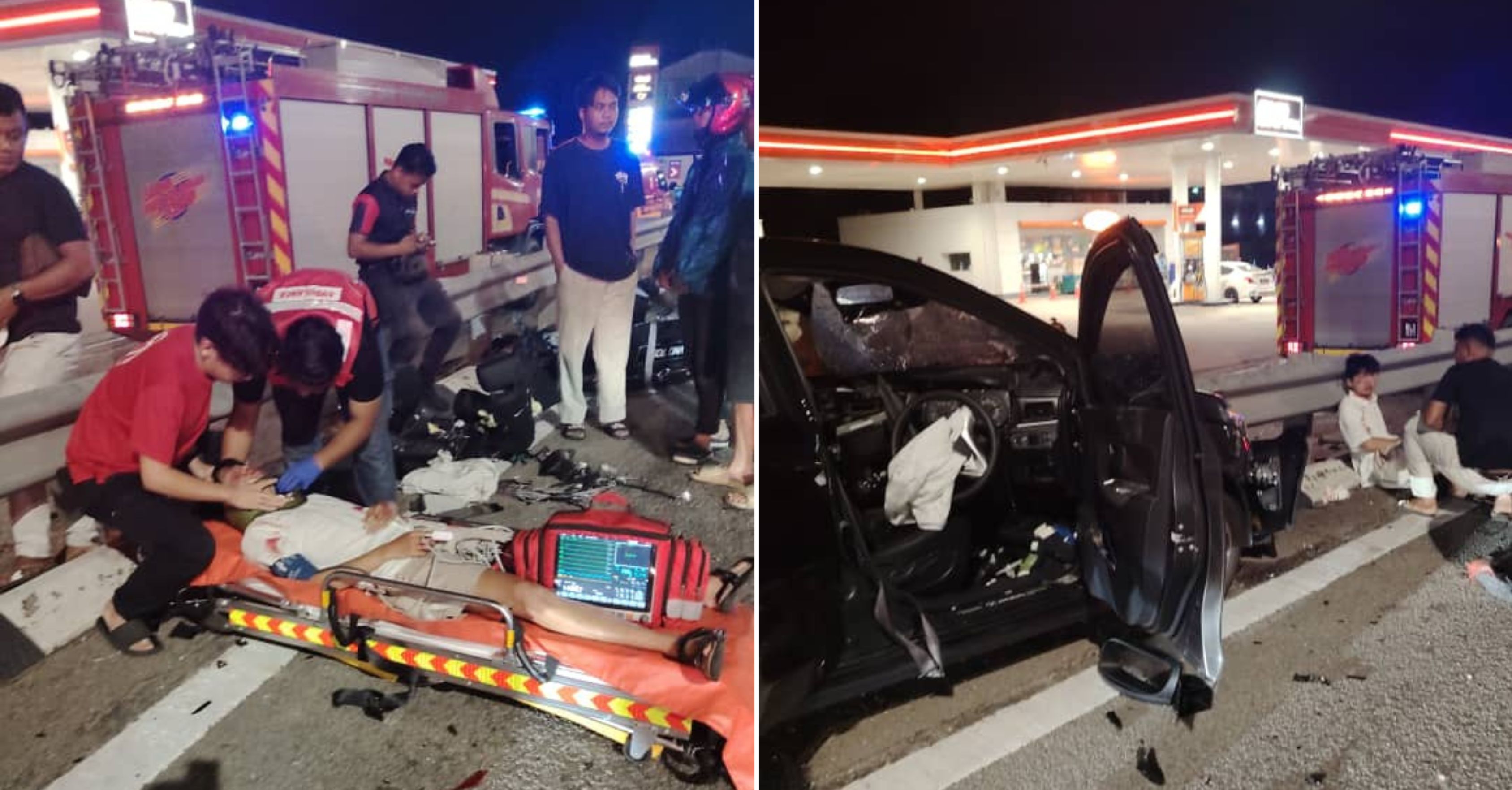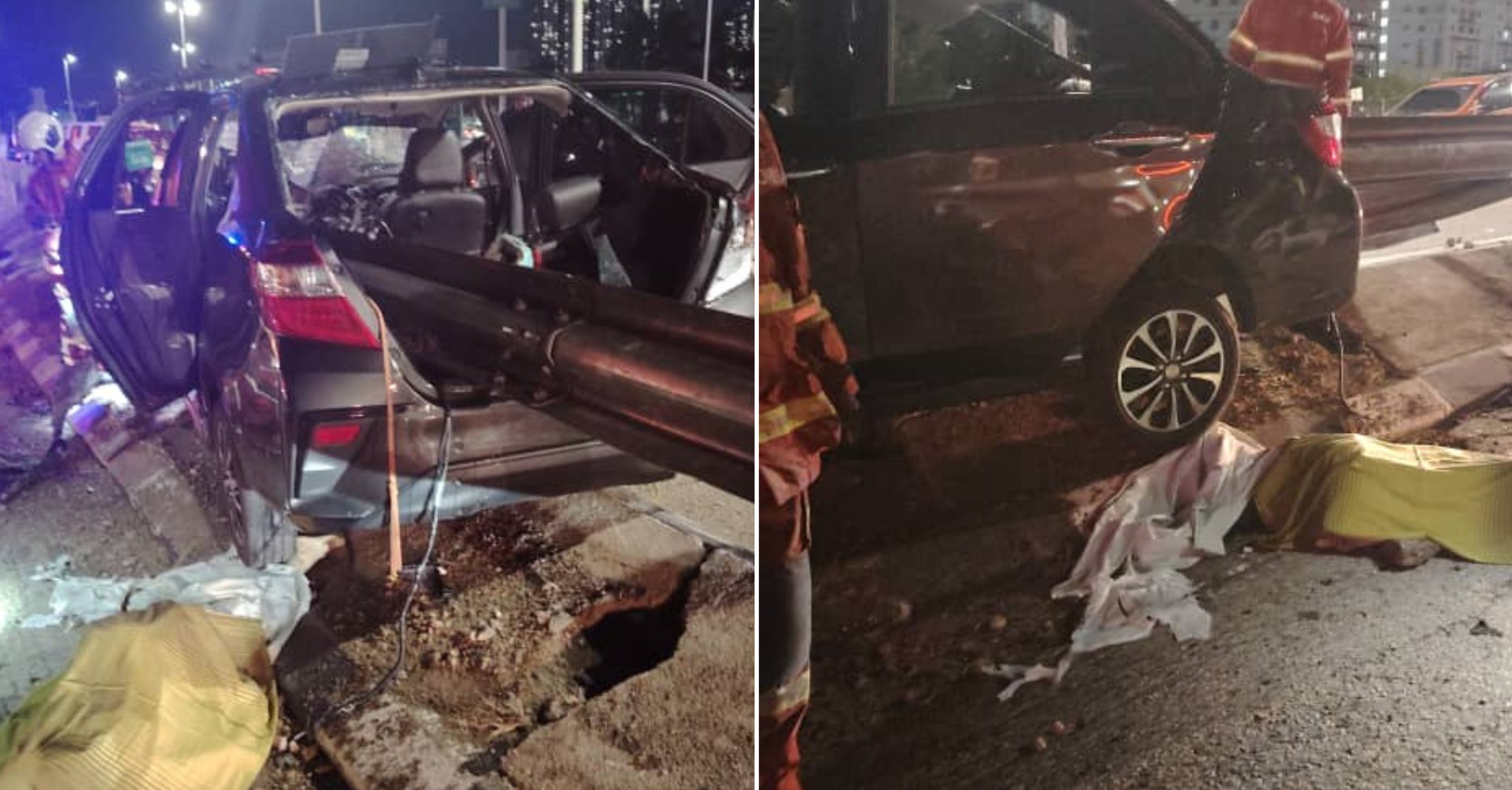 恐怖车祸!一辆电召车失控撞到分界堤,复遭护栏穿透车身,造成一名年轻女乘客重伤不幸当场身亡,另一男性乘客和司机轻伤。