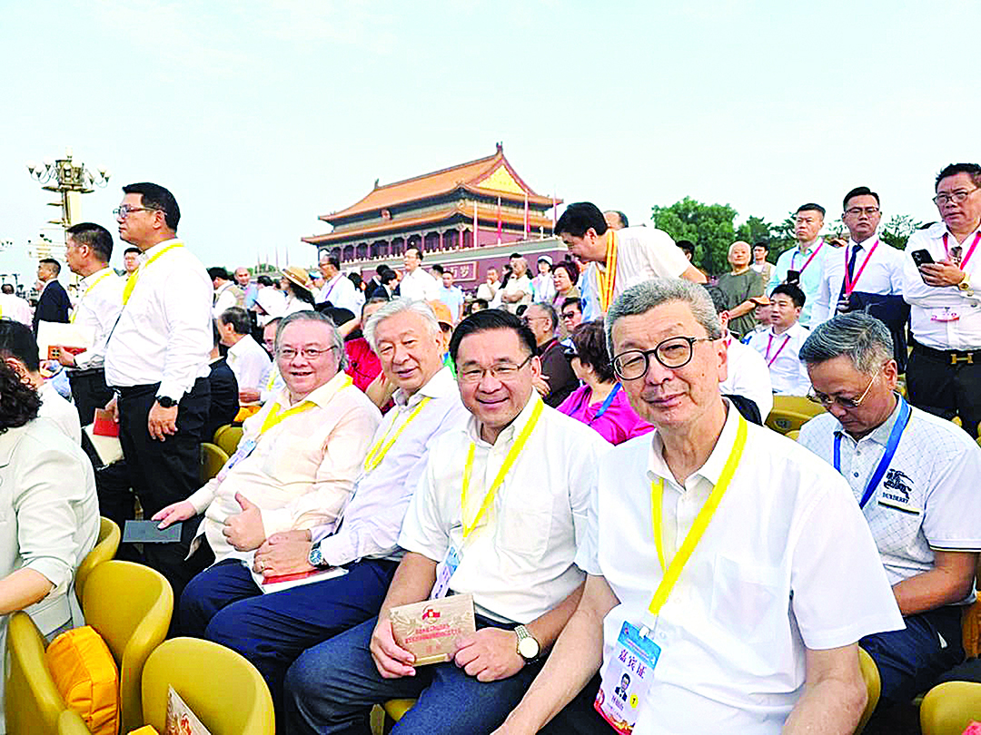 林福山(右1)早前与我国华社领导一同受邀出席在北京天安门广场举行的盛大阅兵仪式。左起为文彬集团总裁暨砂中友好协会会长拿督黄国忠、马中商务理事会主席丹斯里卢成全,以及马来西亚中国公共关系协会副会长拿督威拉颜天禄。