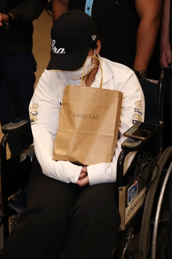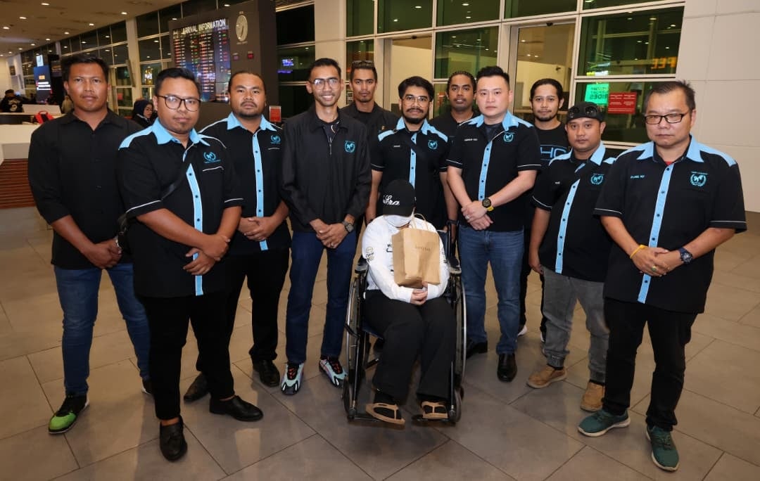 MHO总秘书拿督希山(左起)、阿西鲁和胡杰良、陪同坐着轮椅的事主,从机场入境处出来。