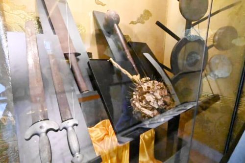 展区内少不了法器文物,如九皇凉伞、九皇大帝笏板、法袍、黑令旗、全马首场罗天大醮会及各种神明法器;并列入该宫征信录石碑和理事会先贤等。