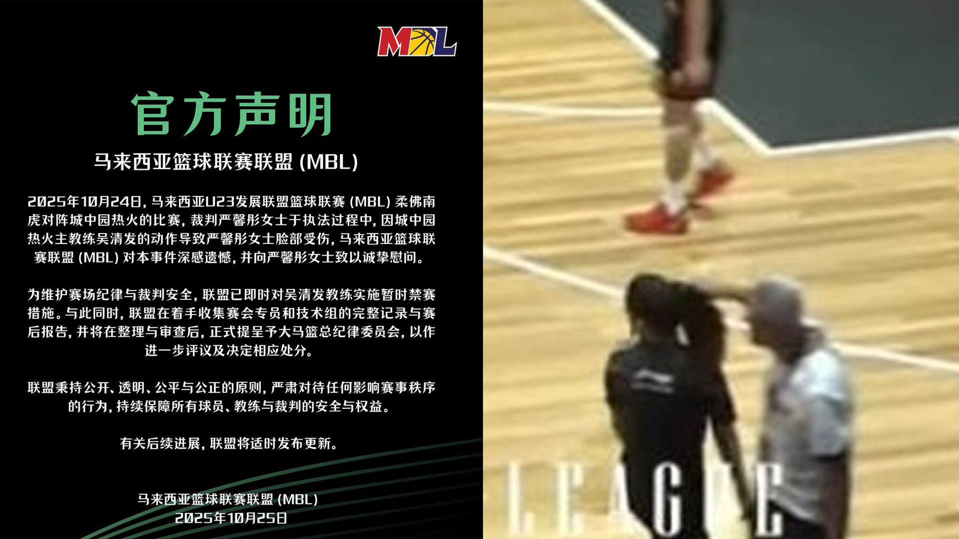 大马篮球联赛联盟在官方声明中表示,裁判严馨彤女士于执法过程中,因城中园热火主教练吴清发的动作导致她脸部受伤,因此联盟深感遗憾,并向严馨彤女士致以诚挚慰问。