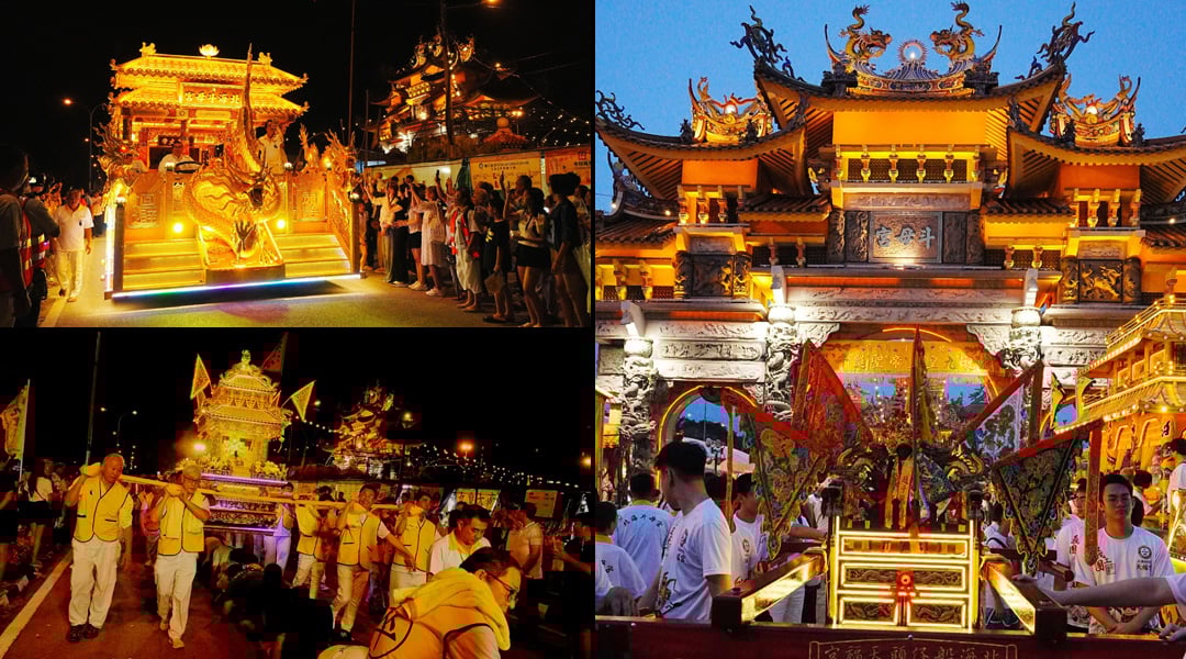 北海斗母宫周六晚(25日)盛大举行九皇大帝圣驾圣谕游境出巡,华丽花车缤纷登场,灯火辉映、花香四溢,整条街道化身璀璨光海;其中有4名孩童首次合力抬神辇登场,场面温馨感人,赢得满场掌声。