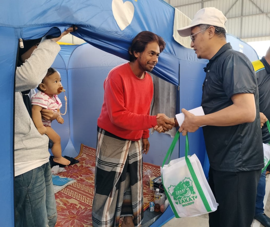 他代表马来西亚民防部队及槟州伊斯兰宗教理事会,向灾民分发援助金丶食物及生活物资,希望能在这艰难时期减轻他们的负担。