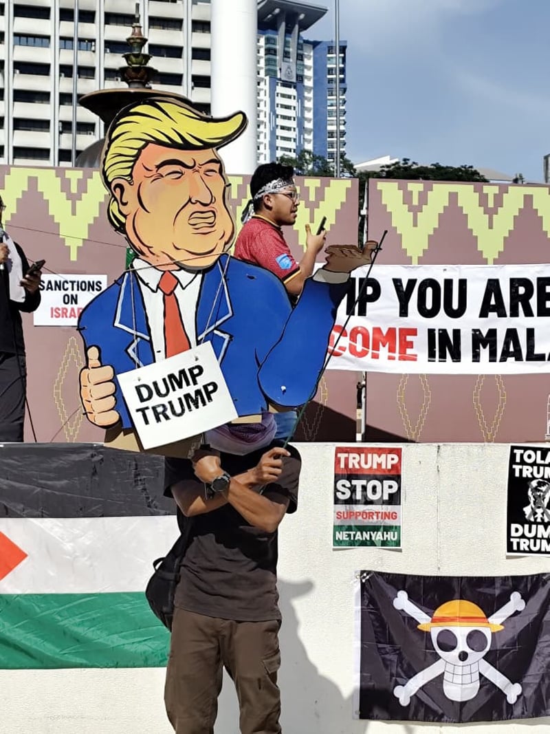 受警方阻挠临时改至吉隆坡独立广场举行的“拒绝特朗普”集会,依然无阻200多名示威者拉布条抗议,高呼要支持以色列侵占巴勒斯坦的美国总统特朗普“离开大马”!
