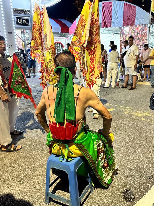 配合九皇爷诞,槟岛日落洞中灵宫上帝公斗母宫周日(26日)晚举行穿针还愿仪式,其中一名最年长的参与者是75岁高龄的男信徒,背部共穿插4支3尺长的钢针。