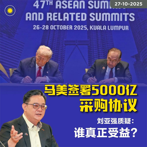 马华副总会长兼经济与中小企业事务委员会主席拿督刘亚强指出,首相拿督斯里安华与美国总统特朗普签署的马美新贸易协议,引发社会热议。据媒体报道,该协议涉及马来西亚国企未来5年将向美国进行总额超过5000亿令吉的巨额采购。