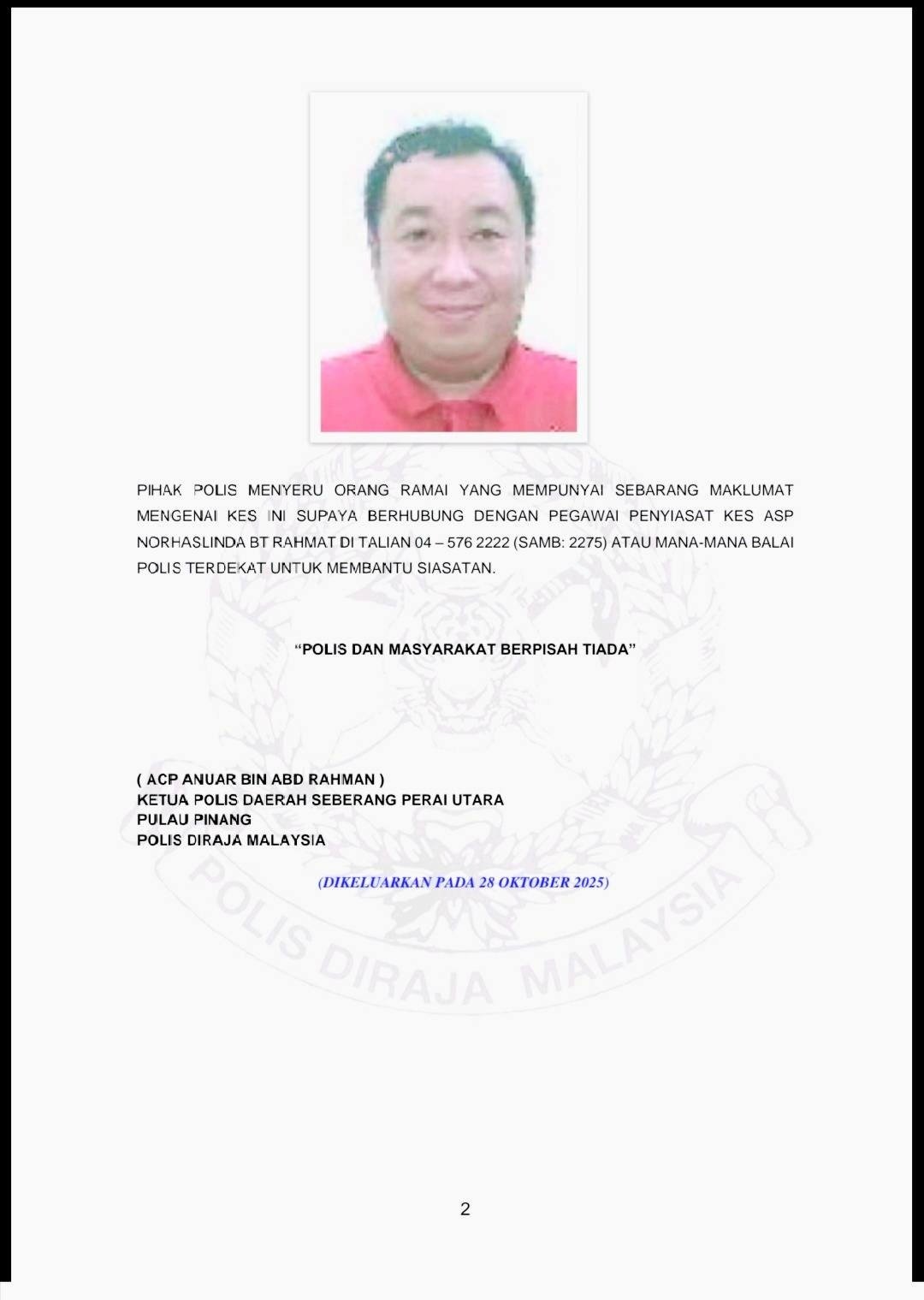 警方呼吁,任何知悉此案或掌握王伟汉行踪的人士,请立即联络案件调查官助理警监诺哈琳达(ASP Norhaslinda Bt Rahmat),电话:04-576 2222(分机:2275),或前往就近的警察局提供相关资讯,以协助警方调查。