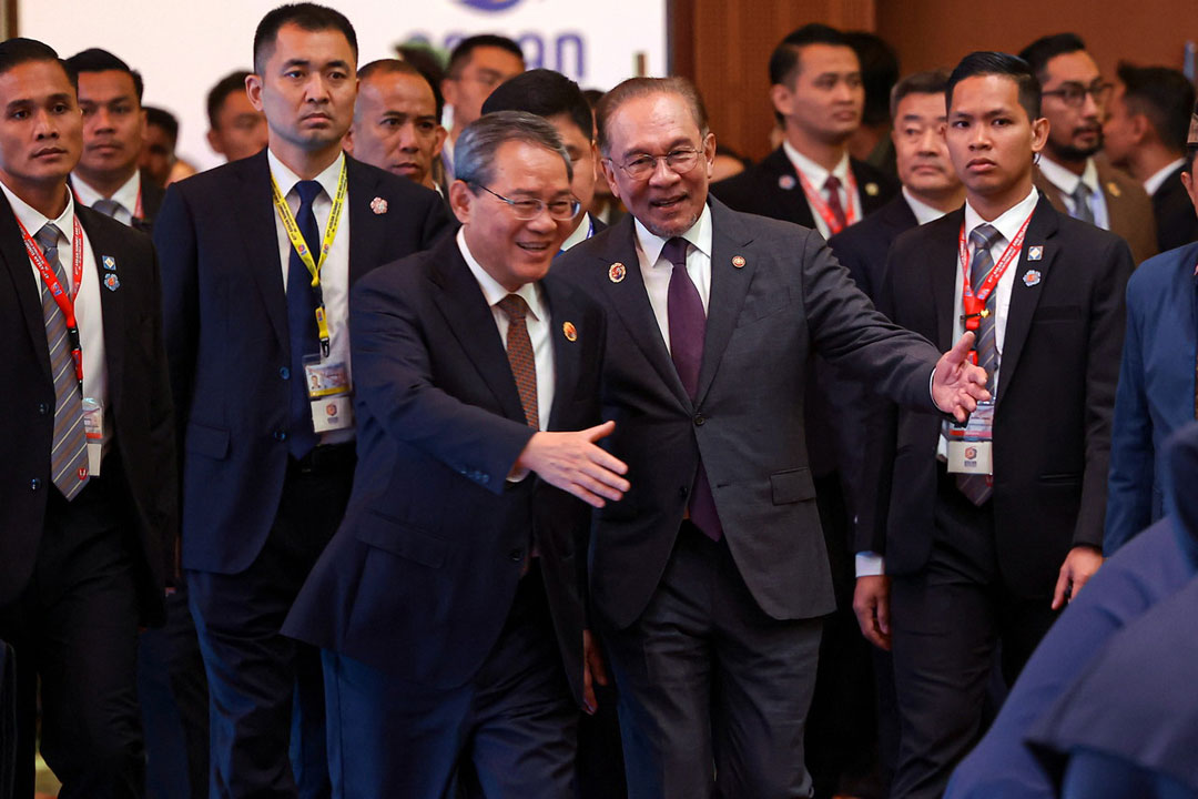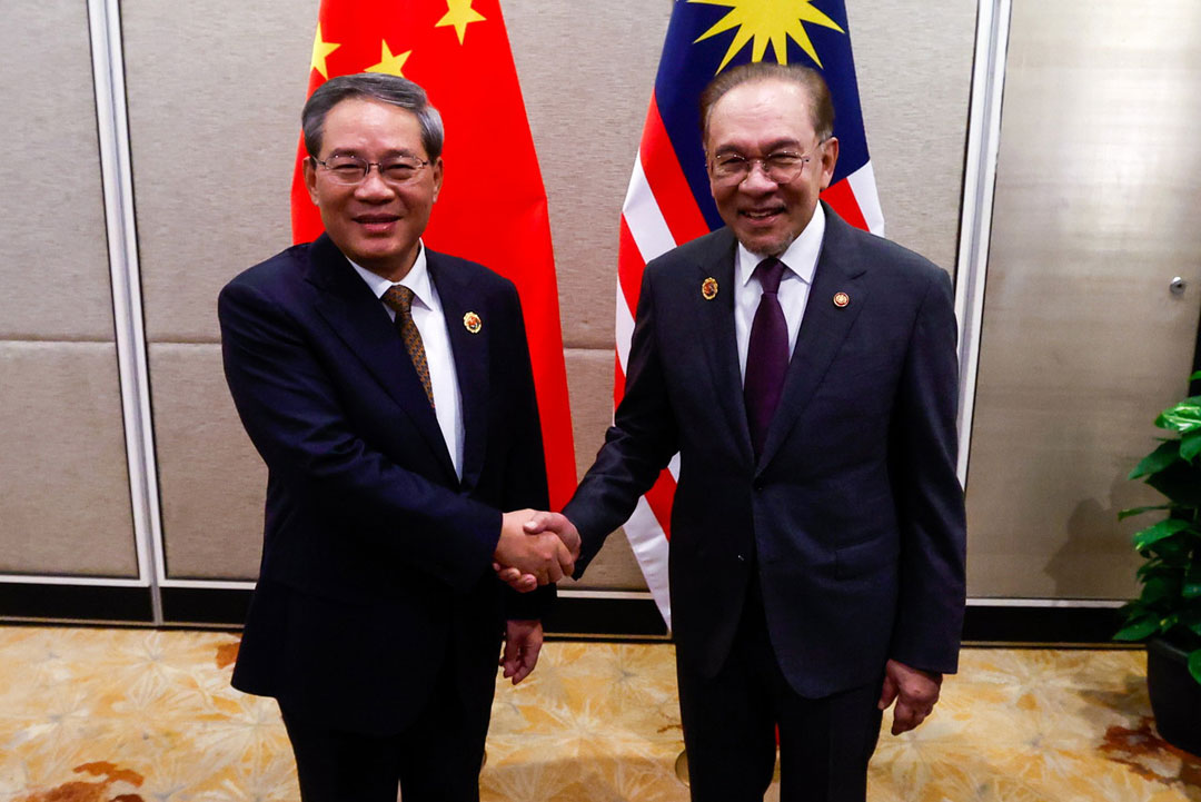 安华(右起)欢迎李强出席第47届东盟峰会,并指出这体现中国坚定而持久的承诺,以强化与东盟的关系。