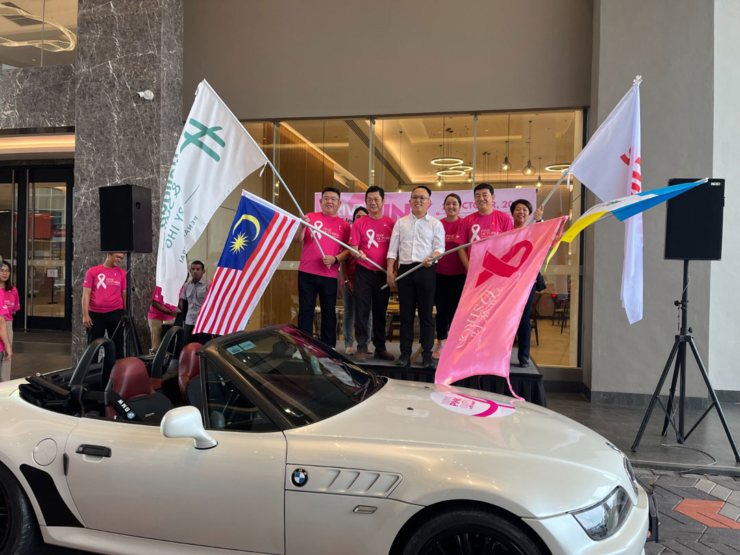 吴俊强(左起)、伍国良、魏子森、郑釧螢、马文荣和郭清根为“Drive Pink, Drive with Heart”粉红十月车队活动主持挥旗仪式。