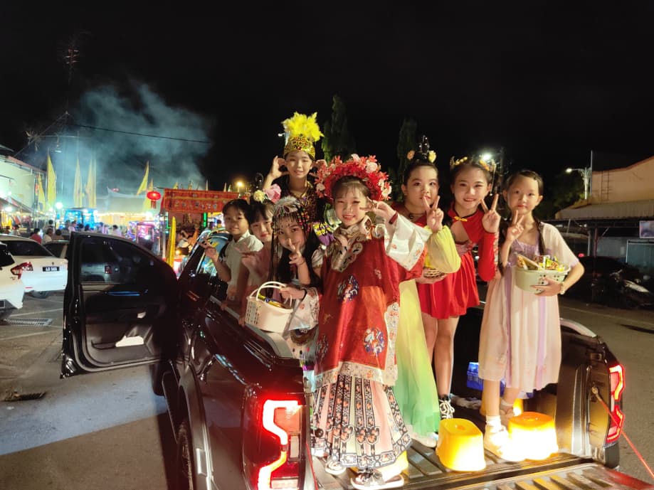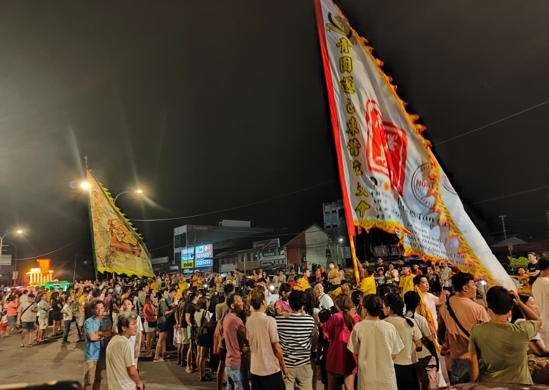 游行队伍从晚上9时许从斗母宫出发,经加央市区各街道,至亚三脚河岸恭送,吸引民众围观街道拍照,气氛 非常热闹。