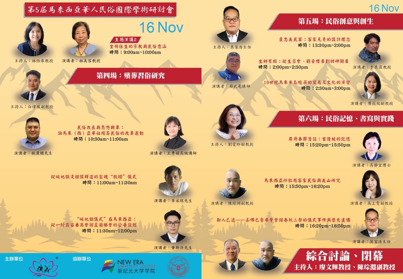 第5届马来西亚华人民俗研究国际学术研讨会将于11月15日与16日,在吉隆坡广义大厦视听室举行,聚焦义山与社群研究、殡葬民俗、跨域民俗文化与民俗创意等多元议题。大会由吉隆坡广东义山主办,作为该义山130周年暨二战结束80周年系列活动之一,并联合新纪元大学学院东南亚学系、历史研究中心及台湾淡江大学共同举办。台湾侨务委员会及客家委员会亦特别资助多位学者旅费,以推动两地学术与文化交流。