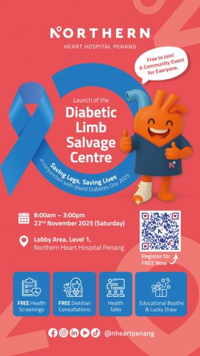 配合2025年世界糖尿病醒觉月,诺灯心脏及血管医院(Northern Heart Hospital Penang)将于11月22日(周六),为其糖尿病保肢中心进行启用仪式,同时发起“拯救双脚,拯救生命”公众健康运动,入场免费。