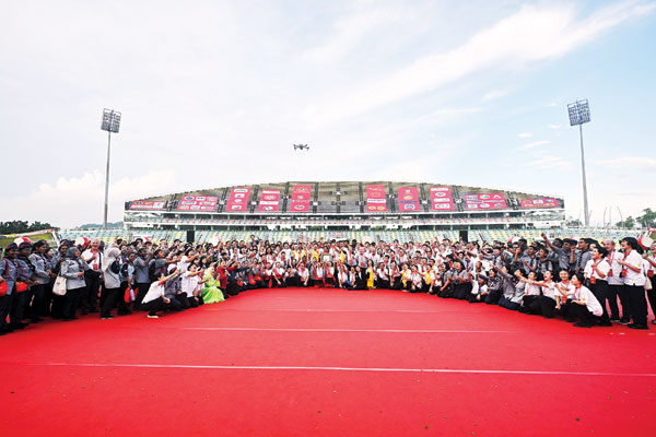 以中华鼓组成的五朵马来西亚国花,献给象征马来西亚团结和谐与友爱。