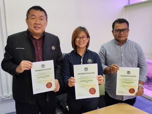 李伟翔(左起)、罗海扎及陈淑湘宣布,从11 月1日起至12月15日,开放榴梿季节性临时执照(Permit Sementara Bermusim)的申请。经营者须妥善处理榴梿壳及废弃物,并且禁止使用保丽龙(Polystyrene)容器。