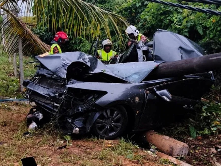 本田雅阁轿车疑失控撞上电线杆后坠入住宅区山坡下,导致28岁巫裔男子当场毙命。