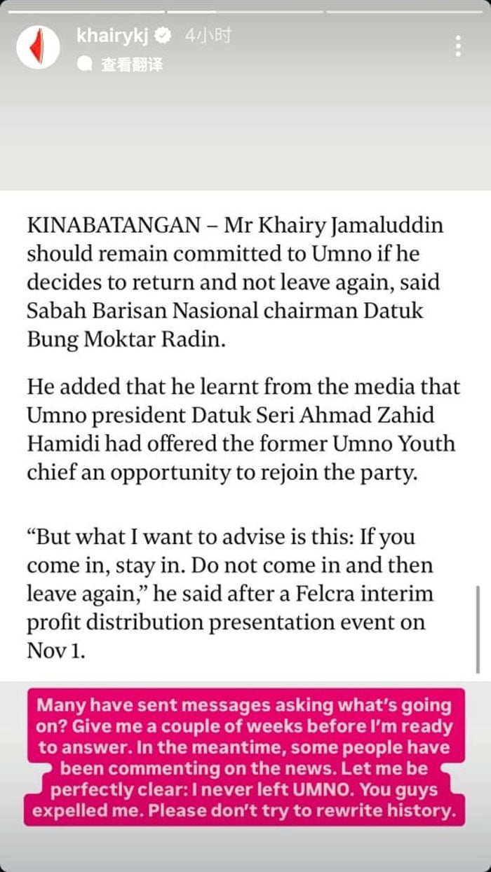 他今日在社交媒体限动上转发有关他将重返巫统的报道,并简短做出回应。