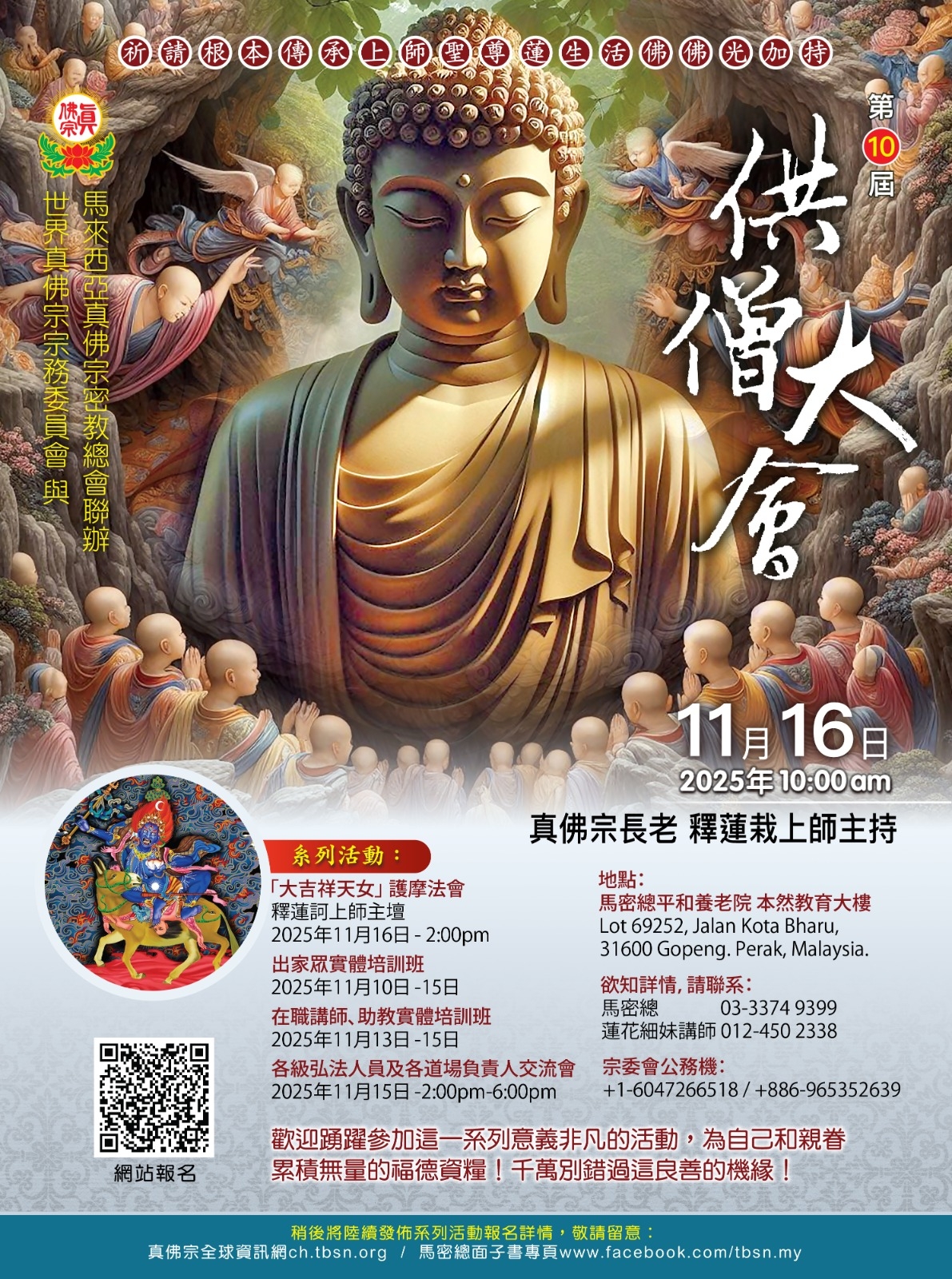 真佛宗世界宗务委员会与马来西亚真佛宗密教总会将于2025年11月16日(星期日),在霹雳州务边区平和养老院隆重举办“2025年第10届供僧大会暨大吉祥天女护摩法会”。此举旨在弘扬供僧精神,护持僧团与佛法慧命。