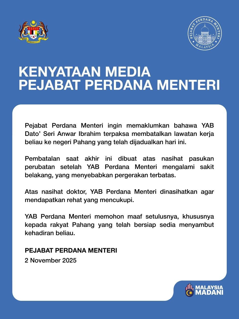 首相办公室发表文告指出,安华目前正面对背痛问题导致行动不便,医生建议他做充分地休息。
