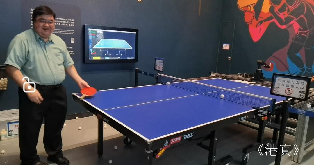美国《美中头条》社长谢忠与人工智能乒乓球机器人。
