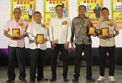 颜喜明颁赠纪念品予受封人士,左起:准拿督李进喜、拿督斯里颜清进、拿督廖石乾、王炜杰PJM。